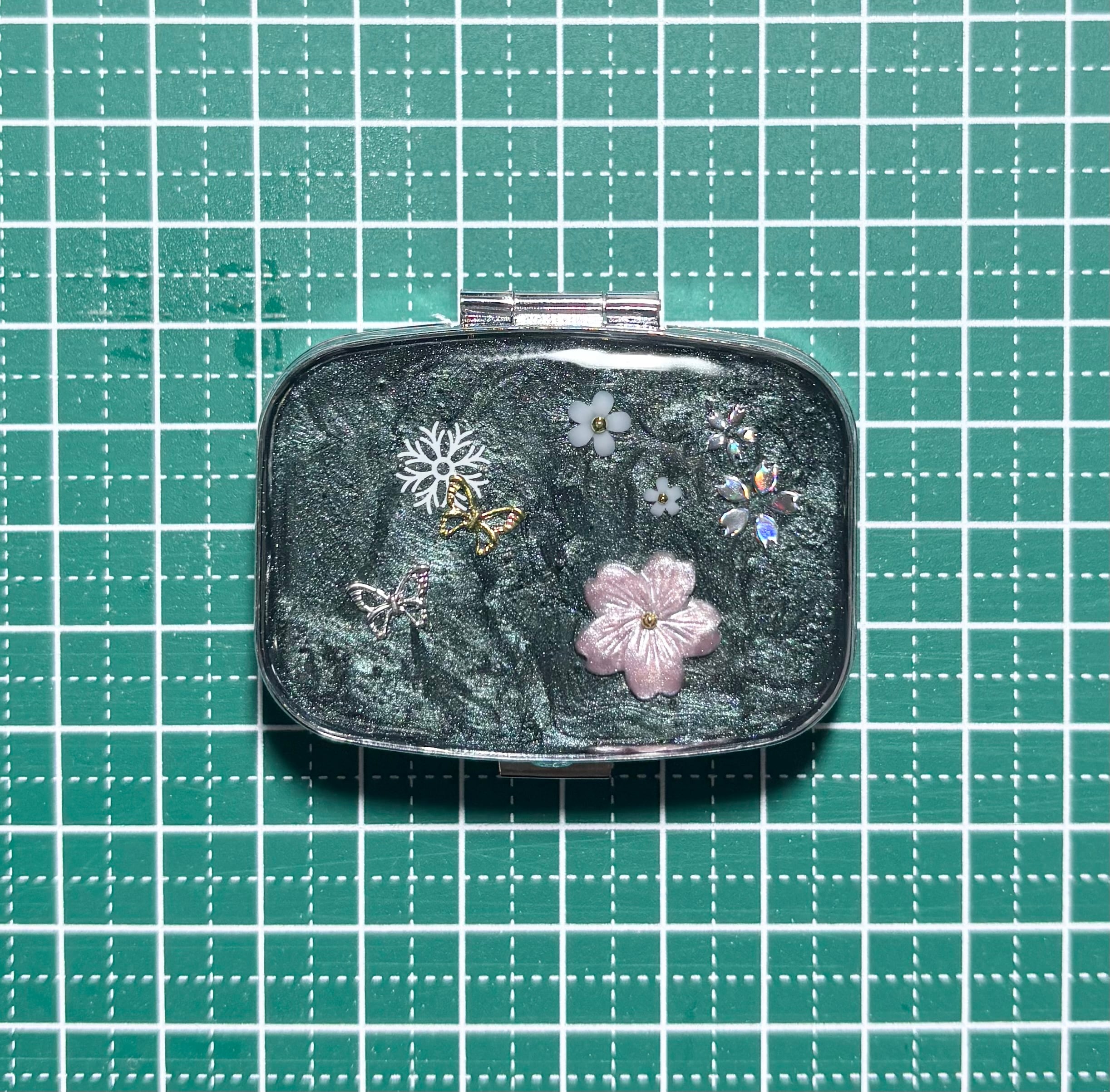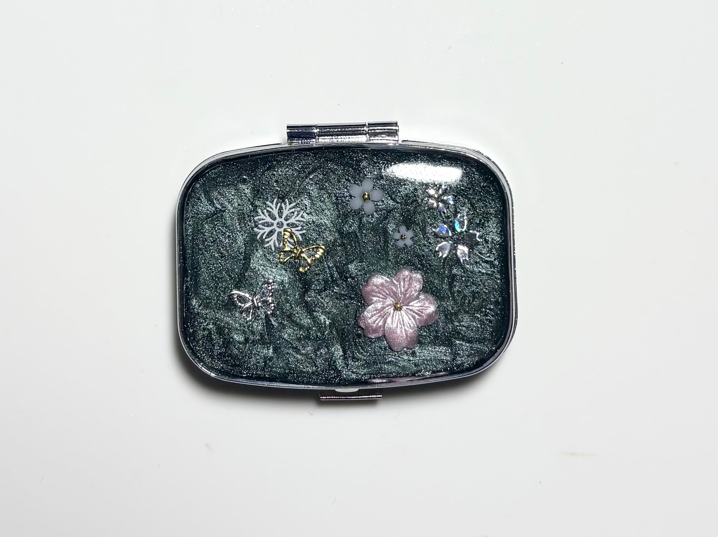 小花、蝶を閉じ込めたピルケースになっています。